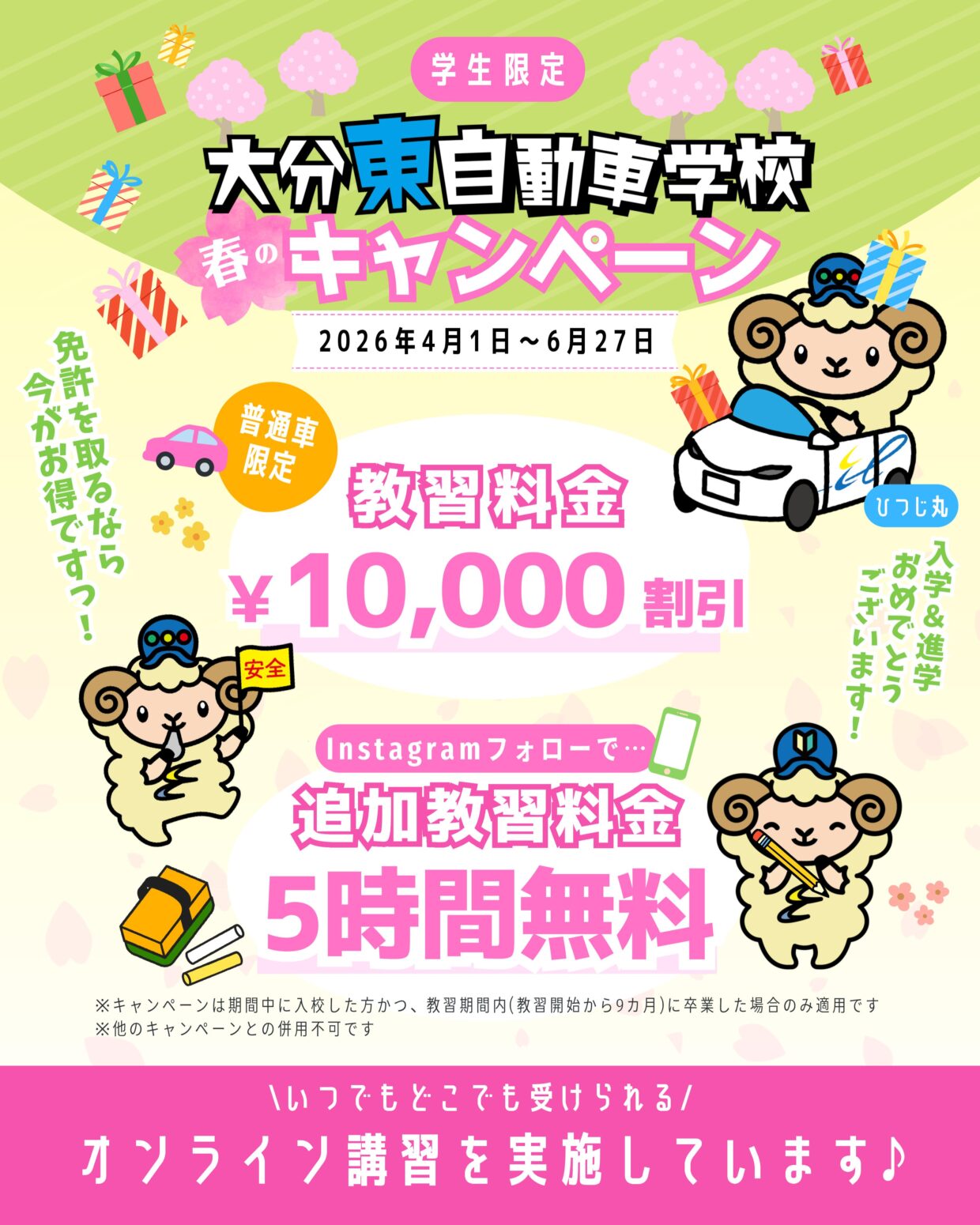 学生さん限定のキャンペーンです。春の新生活と一緒に免許も取ってみませんか?お得な特典もあるのでご入校をお待ちしております!ご不明な点等ございましたらお問い合わせ下さいね。